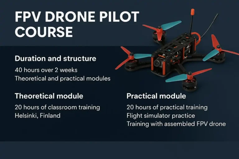 Become an FPV drone expert! This 40-hour in-person course covers assembly, mechanics, and piloting. Build your own FPV drone and master flight in stabilized, acro, and indoor modes. Taught by IDAFinland instructors in Helsinki.